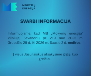 Informuojame, kad MB „Mokymų energija” nuo 2025 m. Gruodžio 29 d. iki 2026 m. Sausio 02 d. nedirbs